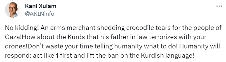 Xulam, K. (2023, October 30). No kidding! an arms merchant shedding crocodile tears for the people of gaza!how about the Kurds that his father in law terrorizes with your drones!don’t waste your time telling humanity what to do! humanity will respond: Act like 1 first and lift the ban on the Kurdish language! pic.twitter.com/GVXGUVSYQT. Twitter. https://twitter.com/AKINinfo/status/1719075566626693576